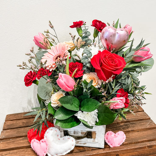 Original price $68.00 - Original price $68.00Original price$68.00$68.00 - $68.00Current price $68.00Our Box Full of Love is a beautiful assorted blooms arrangement filled with red, pinks and whites. Approx size 10” x 12”. All arrangements are sen...
