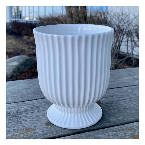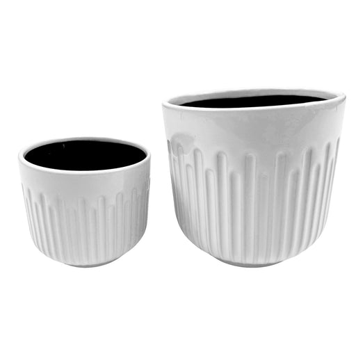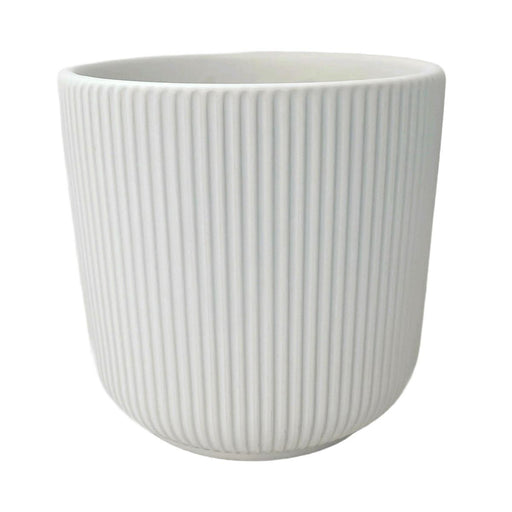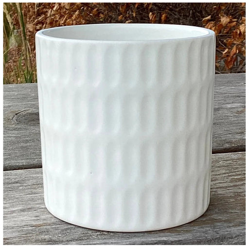White Vertical Textured Ceramic Pot. Available in 2 sizes. No drainage hole Small - 4.75" Diameter x 4.25" Height.  Fits 4" nursery pot. Large - 6....
