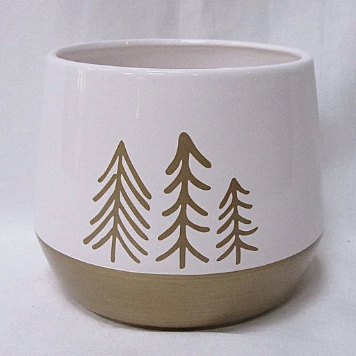 Ceramic Reindeer with trees with no drainage hole. medium 4.7D X 4.3"H. Fits a 4” Nursery Pot.  large 6.7"DX5.5"H  Fits a 6" Nursery Pot.