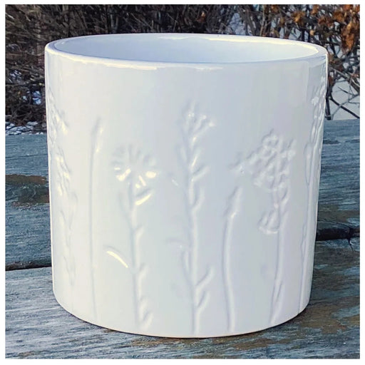 White Wildflower Print Embossed Ceramic Cylinder Pot fits a 4" nursery pot. NO drainage hole.  4.7"DX4.3"H