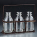3 glass bottle vases with a metal caddy. Small bud vases.