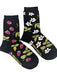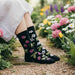 These limited edition mismatched floral socks showcase raspberry blooms and fruit on a bold black base for a modern botanical look.